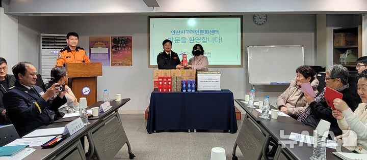 [안산=뉴시스] 22일 오후 조선호 경기도소방재난본부장이 안산 고려인 문화센터를 찾아 현장 안전 지도를 실시한 뒤 주택용 소방시설을 전달하고 있다. (사진=경기도소방재난본부 제공) 2025.1.22. [email protected]