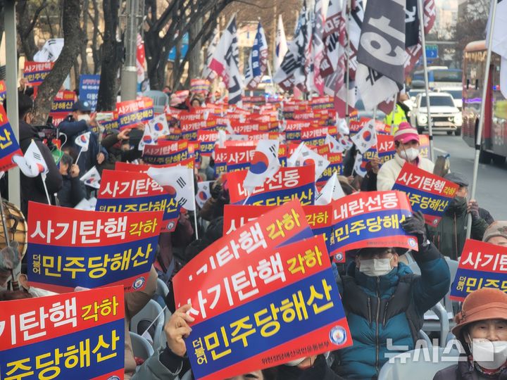 [대구=뉴시스] 이상제 기자 = 22일 대구 중구 공평동 대구시티센터 앞에서 구국 대구투쟁본부와 위국본 대구본부가 '탄핵 무효', '이재명 구속', '선관위 해체' 등을 외치며 탄핵 반대 대구시국집회를 하고 있다. 2025.01.22. [email protected]
