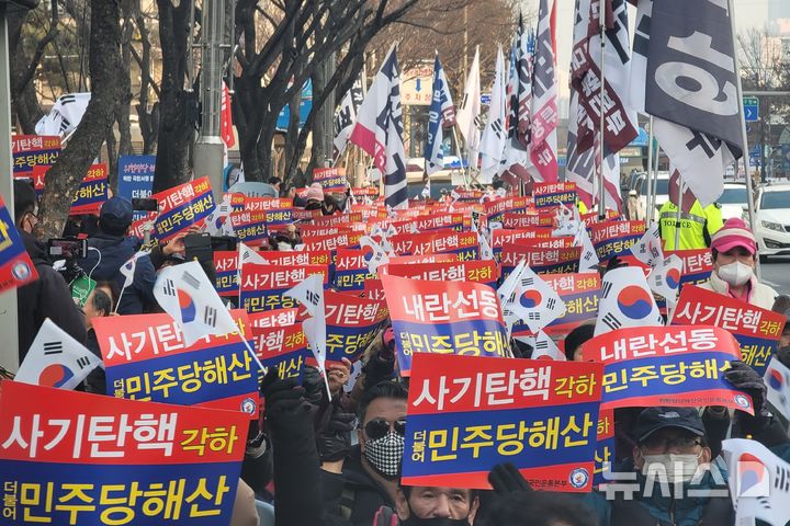 [대구=뉴시스] 이상제 기자 = 22일 대구 중구 공평동 대구시티센터 앞에서 구국 대구투쟁본부와 위국본 대구본부가 '탄핵 무효', '이재명 구속', '선관위 해체' 등을 외치며 탄핵 반대 대구시국집회를 하고 있다. 2025.01.22. [email protected]