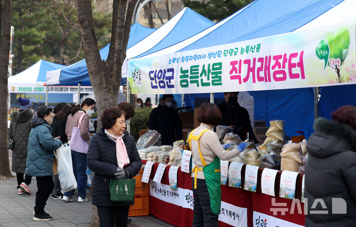 [서울=뉴시스] 김선웅 기자 = 22일 서울 송파구청에서 열린 농수산물 직거래장터에서 고객들이 각종 농수산물을 구매하고 있다.