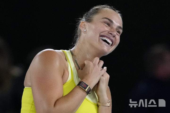 [멜버른=AP/뉴시스] 아리나 사발렌카(1위·벨라루스)가 23일(현지 시간) 호주 멜버른의 로드 레이버 아레나에서 열린 호주오픈 여자 단식 4강전에서 파울라 바도사(12위·스페인)를 꺾은 후 기뻐하고 있다. 3연패를 노리는 사발렌카가 생애 처음으로 메이저 4강에 올라온 바도사를 2-0(6-4 6-2)으로 꺾고 결승에 올랐다. 2025.01.23.