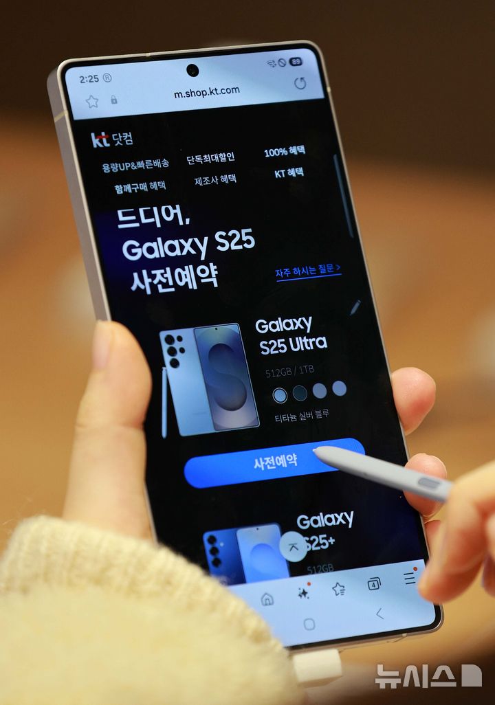 [서울=뉴시스] 고범준 기자 = 23일 오후 서울 마포구 KT플라자 홍대애드샵플러스점에서 직원이 삼성전자 갤럭시 S25 제품을 살펴보고 있다.