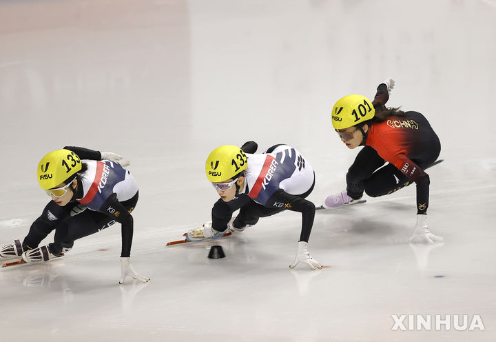 [토리노=신화/뉴시스] 김길리(왼쪽)와 서휘민이 23일(현지 시간) 이탈리아 토리노에서 열린 2025 FISU 토리노 동계세계대학경기대회(유니버시아드) 쇼트트랙 여자 1000m 결승 경기를 치르고 있다. 김길리는 1분31초559의 기록으로 금메달을, 서휘민은 1분31초709로 은메달을 목에 걸었다. 2025.01.24.