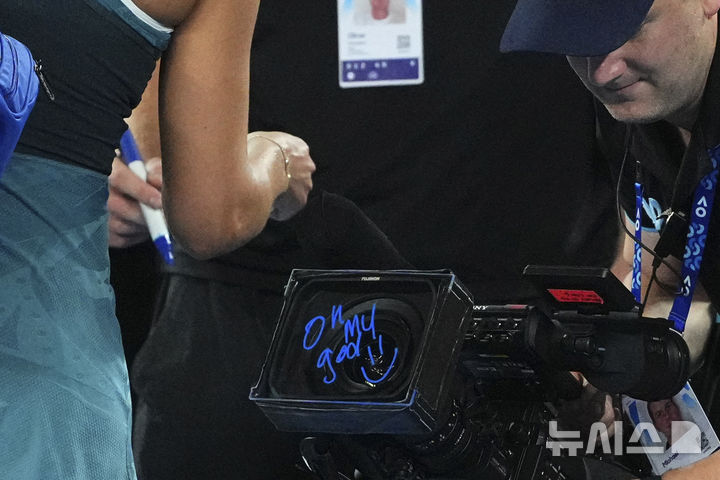 [멜버른=AP/뉴시스] 매디슨 키스(14위·미국)가 23일(현지 시간) 호주 멜버른의 로드 레이버 아레나에서 열린 호주오픈 여자 단식 4강전에서 이가 시비옹테크(2위·폴란드)를 꺾은 후 방송용 카메라에 메시지를 적고 있다. 키스가 2-1(5-7 6-1 7-6)로 역전승하고 결승에 올라 3연패를 노리는 아리나 사발렌카(1위·벨라루스)와 우승을 다툰다. 2025.01.24.