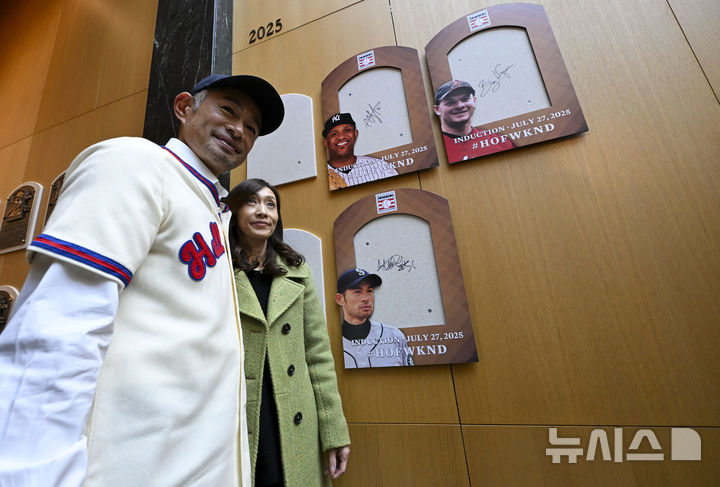 [쿠퍼스타운=AP/뉴시스] 미국 프로야구(MLB) 명예의 전당(HOF)에 헌액된 시애틀 매리너스의 전 외야수 이치로 스즈키가 23일(현지 시간) 뉴욕주 쿠퍼스타운에 있는 HOF에서 아내 유미코와 함께 본인의 명패가 걸릴 곳에 서서 기념 촬영하고 있다. 2025.01.24.