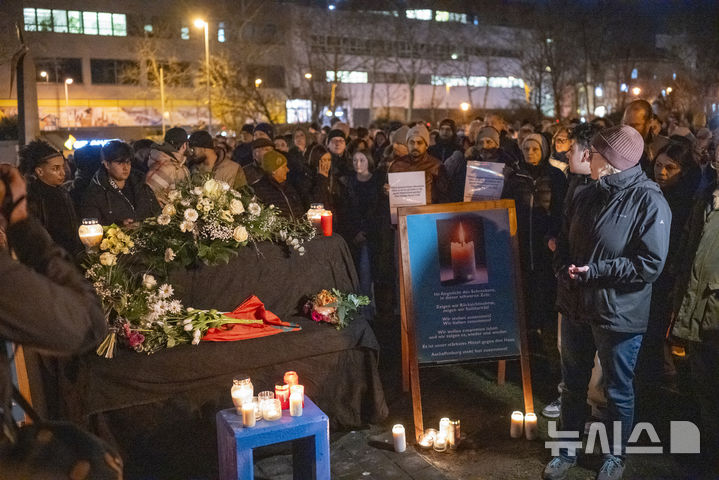 [아샤펜부르크=AP/뉴시스] 23일(현지 시간) 독일 아샤펜부르크의 쇤탈공원에서 발생한 흉기 난동 현장에 시민들이 모여 희생자들을 기리고 있다. 지난 22일 이곳에서 아프가니스탄 국적 남성이 흉기를 휘둘러 2세 아이와 40대 남성이 숨지고 다른 2명이 부상했다. 용의자는 범행 직후 도주하다가 경찰에 체포됐다. 2025.01.24.