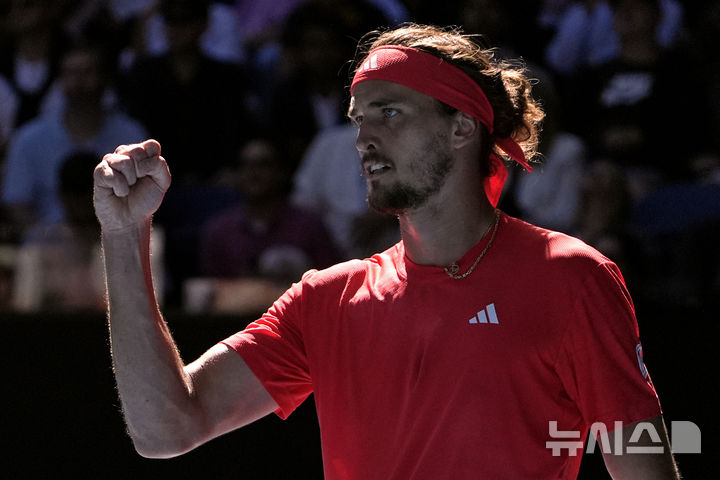 [멜버른=AP/뉴시스] 알렉산더 즈베레프(2위·독일)가 24일(현지 시간) 호주 멜버른의 로드 레이버 아레나에서 열린 호주오픈 남자 단식 4강전 노바크 조코비치(7위·세르비아)와 경기 1세트를 따낸 후 세리머니하고 있다. 즈베레프는 세트 스코어 1-0(7-6) 상황에서 조코비치가 부상으로 기권해 생애 처음으로 호주오픈 결승에 올랐다. 2025.01.24.