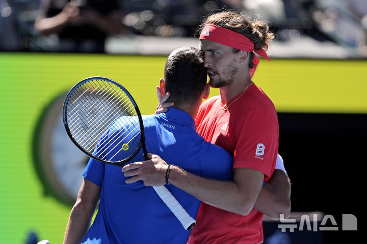 [멜버른=AP/뉴시스] 알렉산더 즈베레프(2위·독일, 오른쪽)가 24일(현지 시간) 호주 멜버른의 로드 레이버 아레나에서 열린 호주오픈 남자 단식 4강전에서 노바크 조코비치(7위·세르비아)에게 기권승을 거둔 후 위로하고 있다. 즈베레프는 세트 스코어 1-0(7-6) 상황에서 조코비치가 기권해 생애 처음으로 호주오픈 결승에 올랐다. 2025.01.24.