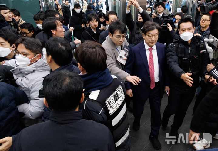항의받으며 서울역 나서는 권성동