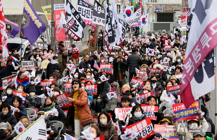 [대구=뉴시스] 이무열 기자 = 25일 대구 중구 동양생명빌딩 앞에서 열린 부정선거 규탄 및 탄핵 반대 집회에서 참석자들이 탄핵무효 구호를 외치고 있다. 2025.01.25. [email protected]