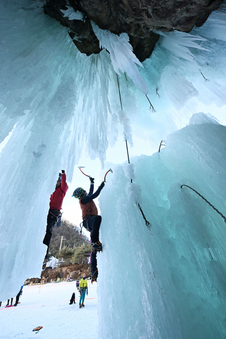 [서울=뉴시스] 설 연휴 첫 날인 25일 강원 양구군 국토정중앙면 용소아이스파크 빙벽장에서 지우알파인클럽 대원들이 50m 빙벽을 오르며 겨울 등반을 만끽하고 있다. 빙벽등반은 특화된 겨울스포츠의 꽃이지만, 체력과 기술력, 정신력, 검증된 장비 준비가 필요한 스포츠이다. (사진= 바보산클럽 제공) 2025.01.25. [email protected] *재판매 및 DB 금지