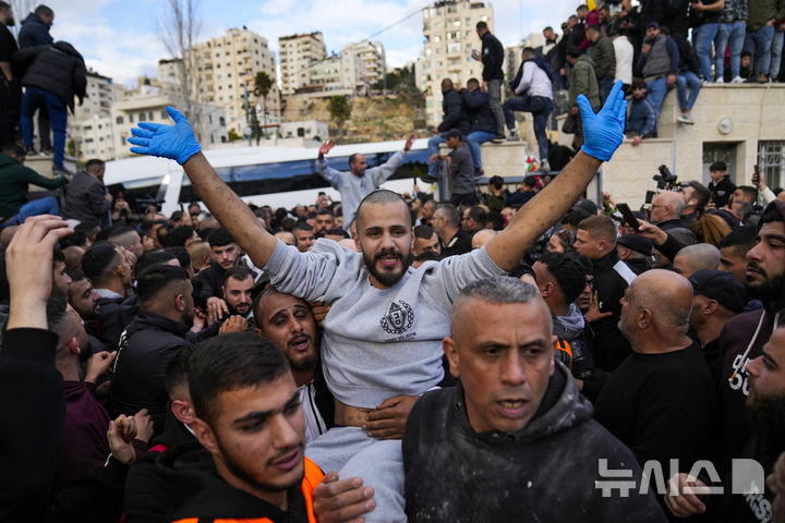 [라말라=AP/뉴시스] 이스라엘이 석방한 팔레스타인 수감자들이 회색 죄수복을 입은 채 25일(현지 시간) 서안지구 라말라에서 군중의 환영을 받고 있다. 이스라엘과 하마스 간의 휴전 협정에 따라 이스라엘 여군 인질 4명과 팔 수감자 200명이 석방됐다. 2025.01.26.