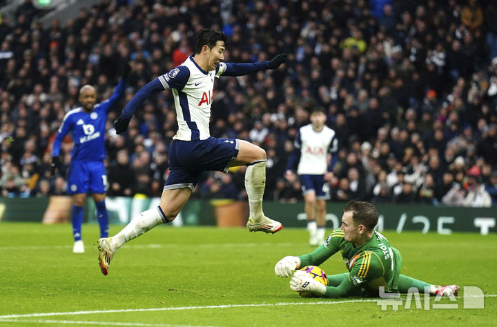[런던=AP/뉴시스] 토트넘 홋스퍼의 손흥민이 26일(현지 시간) 영국 런던의 토트넘 홋스퍼 스타디움에서 열린 2024-25 프리미어리그 23라운드 레스터 시티를 상대로 경기하고 있다. 손흥민이 풀타임을 소화한 토트넘은 1-2로 역전패하면서 리그 15위를 기록했다. 2025.01.27.