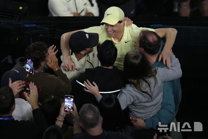 [멜버른=AP/뉴시스] 얀니크 신네르(1위·이탈리아)가 26일(현지 시간) 호주 멜버른의 로드 레이버 아레나에서 열린 호주오픈 남자 단식 결승에서 알렉산더 즈베레프(2위·독일)를 꺾은 후 코치진과 자축하고 있다. 신네르는 즈베레프를 3-0(6-3 7-6 6-3)으로 완파하고 2연패를 달성했다. 2024.01.27.