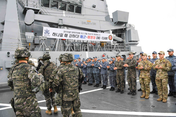 [서울=뉴시스] 김근수 기자 = 1일 경남 진해 군항에서 코브라골드 연합훈련에 참가하는 해병대 장병들이 해군 노적봉함(상륙함, 4,900톤급) 장병들의 환영을 받으며 승함하고 있다. (사진= 해군 제공) 2025.02.01. [email protected] *재판매 및 DB 금지