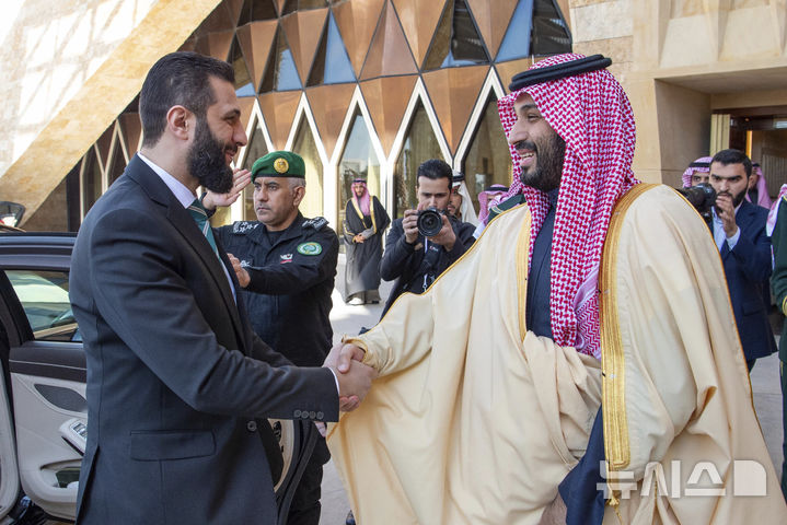 [리야드=AP/뉴시스] 사우디아라비아를 방문한 시리아 과도정부의 아메드 알샤라 임시 대통령(왼쪽)이 2일(현지 시간) 리야드에서 무함마드 빈 살만 왕세자와 악수하고 있다. 알샤라는 취임 이후 첫 해외 방문으로 사우디를 찾았다. 2025.02.03.