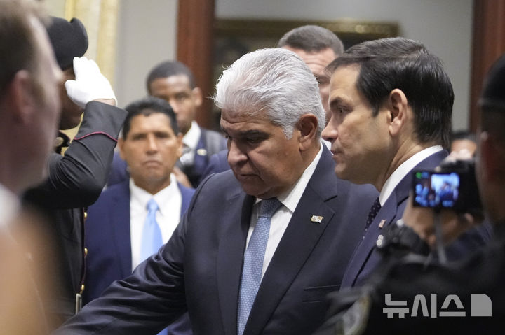 [파나마시티=AP/뉴시스] 호세 라울 물리노(왼쪽) 파나마 대통령이 2일(현지 시간) 마코 루비오 미국 국무장관과 함께 파나마시티의 대통령궁 회담장에 도착하고 있다. 물리노 대통령은 회담 후 기자회견에서 "파나마 운하는 파나마가 운영하며 앞으로도 그럴 것"이라고 말했다. 2025.02.03.