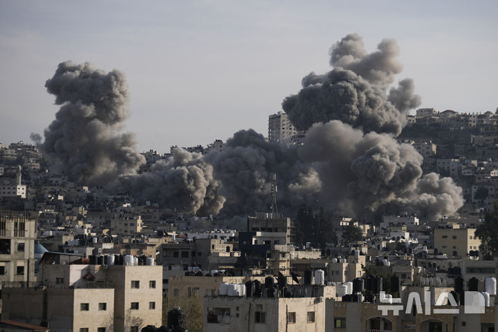 [제닌=AP/뉴시스] 2일(현지 시간) 요르단강 서안지구 제닌 난민촌에서 이스라엘의 공습으로 인한 폭발로 연기가 피어오르고 있다. 이스라엘은 대테러 작전의 일환으로 공습을 가했다고 밝혔으며 팔레스타인 보건부는 이 공습으로 2명이 숨지고 16세 소년이 부상했다고 밝혔다. 2025.02.03.