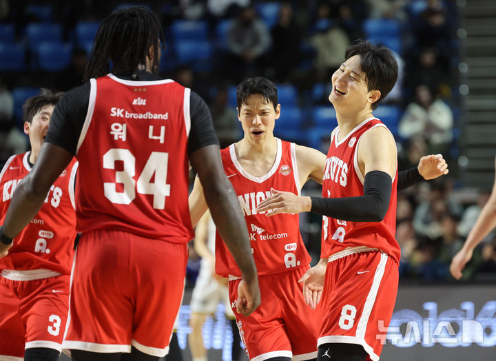 [서울=뉴시스] 김금보 기자 = 3일 서울 송파구 잠실학생체육관에서 열린 프로농구 2024~2025 KBL리그 서울 SK 나이츠와 창원 LG 세이커스의 경기, 4쿼터 SK 안영준이 3점슛을 넣고 동료들과 기뻐하고 있다. 2025.02.03. [email protected]