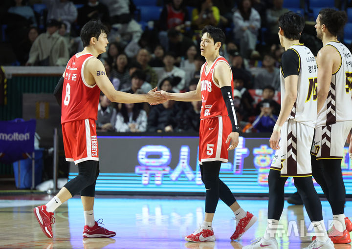 [서울=뉴시스] 김금보 기자 = 3일 서울 송파구 잠실학생체육관에서 열린 프로농구 2024~2025 KBL리그 서울 SK 나이츠와 창원 LG 세이커스의 경기, 78-70으로 승리한 SK 안영준과 김선형이 하이파이브를 하고 있다. 2025.02.03. [email protected]