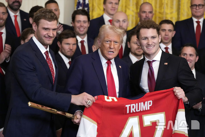 [워싱턴=AP/뉴시스] 도널드 트럼프(가운데) 미국 대통령이 3일(현지 시간) 백악관 이스트룸에서 2024 북미아이스하키리그(NHL) 스탠리컵 우승 팀인 플로리다 팬서스를 초청해 우승 축하연을 열고 선물 받은 하키 스틱과 본인의 이름이 새겨진 유니폼을 들고 기념 촬영하고 있다. 2025.02.04.