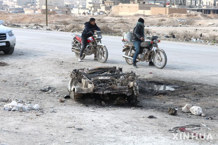 [만비즈=신화/뉴시스] 3일(현지 시간) 시리아 만비즈에서 차량 폭탄 테러가 발생해 현장에 잔해가 남아 있다. 시리아 임시 정부는 폭탄 테러 책임자를 처벌할 것을 다짐하면서 최소 20명이 숨지고 여러 명이 부상했다고 밝혔다. 2025.02.04.