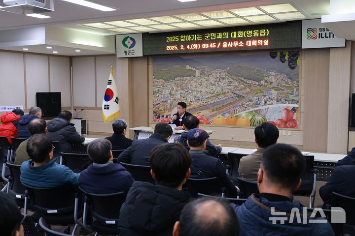 [영동=뉴시스] 정영철 충북 영동군수가 4일 오전 영동읍 영동읍사무소에서 주민 대표자들을 대상으로 '찾아가는 군민과의 대화' 간담회를 진행하고 있다. 정 군수는 11일가지 11개 읍·면을 돌며 현장의 목소리를 청취한다. (사진=영동군 제공) 2025.02.04. photo.newsis.com