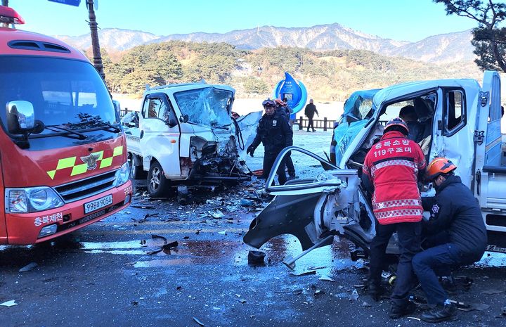 [제천=뉴시스] 이병찬 기자 = 4일 오전 충북 제천시 의림지동 의림지 입구 도로에서 119구급대원들이 사고 차량 인명 구조 작업을 하고 있다.(사진=제천소방서 제공)[email protected]