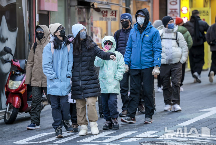 [서울=뉴시스] 정병혁 기자 =  서울에 올해 첫 한파경보가 발령된 4일 서울 중구 명동을 찾은 여행객들이 강풍을 맞으며 이동하고 있다. 2025.02.04. [email protected]