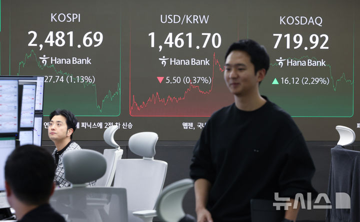 [서울=뉴시스] 황준선 기자 = 코스피가 전 거래일(2453.95)보다 27.74포인트(1.13%) 오른 2481.69에 장을 마친 4일 오후 서울 중구 하나은행 딜링룸 전광판에 지수가 표시돼 있다. 코스닥지수는 전 거래일(703.80)보다 16.12포인트(2.29%) 상승한 719.92에 거래를 종료했다. 서울 외환시장에서 원·달러 환율은 전 거래일(1467.2원)보다 4.3원 내린 1462.9원에 마감했다. 2025.02.04. [email protected]