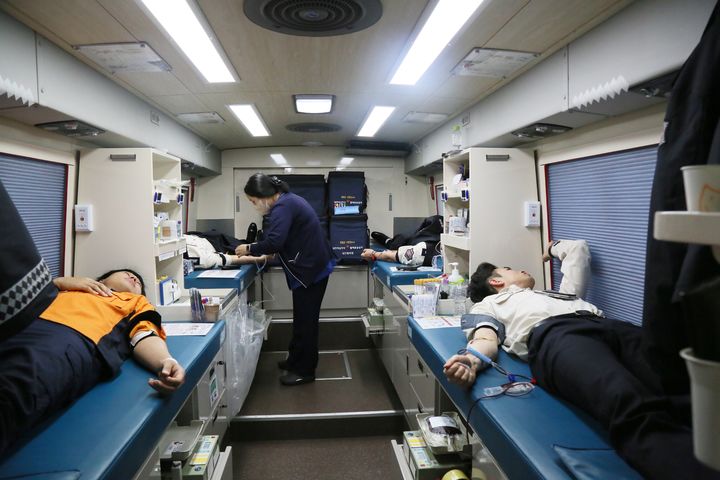 [당진=뉴시스] 김덕진 기자=당진소방서 소속 소방공무원과 당진의용소방대원들이 5일 당진소방서 광장에 주차한 이동식 헌혈버스 안에서 '사랑의 헌혈' 행사에 동참하며 헌혈을 하고 있다. (사진=당진소방서 제공) 2025.02.05. [email protected]