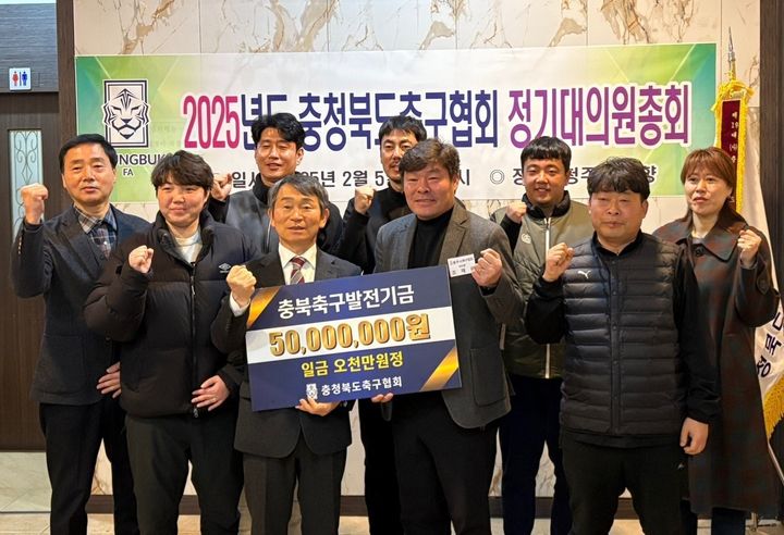 [청주=뉴시스] 강성덕 충청북도축구협회장이 5일 청주 천리향 음식점에서 열린 '2025년도 충북축구협회 정기 대의원총회'에서 지역 축구 발전기금으로 5천만원을 전달하며 기념 촬영을 하고 있다. (사진=충청북도체육회 제공) 2025.02.05. [email protected]