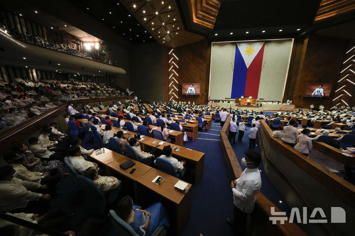 [마닐라(필리핀)=AP/뉴시스]필리핀 의원들이 2022년 7월25일 퀘손시티의 의사당에서 페르디난드 마르코스 주니어 대통령의 첫 국정연설을 경청하고 있다. 로드리고 두테르테 전 필리핀 대통령의 딸인 사라 두테르테 필리핀 부통령에 대한 탄핵안이 5일 필리핀 하원에서 최소 215명 의원들의 찬성으로 통과됐다고 한 필리핀 관리가 밝혔다. 2025.02.05.