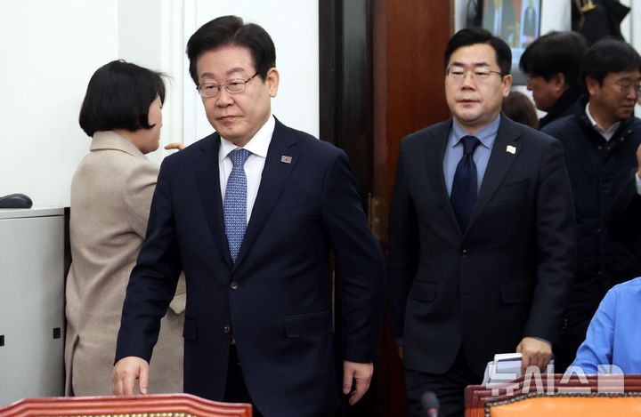 [서울=뉴시스] 조성봉 기자= 이재명 더불어민주당 대표와 박찬대 원내대표가 5일 오전 서울 여의도 국회에서 열린 최고위원회의에 참석하고 있다. 2025.02.05. [email protected]