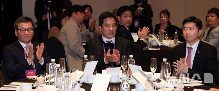 [서울=뉴시스] 이영환 기자 = 5일 서울 용산구 서울드래곤시티 그랜드볼룸 한라에서 열린 2026 강릉세계마스터즈탁구선수권대회 조직위원회 출범식에서 공동조직위원장에 선출된 김홍규(왼쪽부터) 강릉시장, 이태성 대한탁구협회장, 유승민 대한체육회장 당선인이 내빈 소개에 박수를 보내고 있다. 2025.02.05. [email protected]