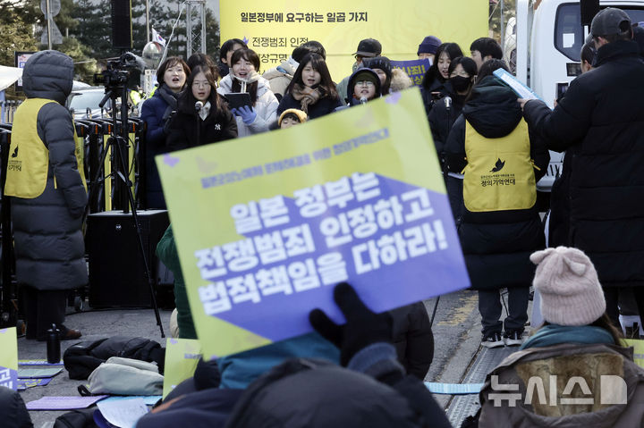 [서울=뉴시스] 최동준 기자 = 5일 서울 종로구 일본대사관 인근에서 열린 제1686차 일본군성노예제 문제해결을 위한 정기 수요시위에서 극단 고래 단원과 어린이들이 합창을 하고 있다. 2025.02.05. [email protected]