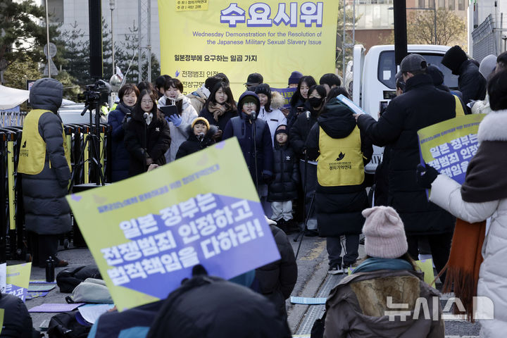 [서울=뉴시스] 최동준 기자 = 5일 서울 종로구 일본대사관 인근에서 열린 제1686차 일본군성노예제 문제해결을 위한 정기 수요시위에서 극단 고래 단원과 어린이들이 합창을 하고 있다. 2025.02.05. [email protected]