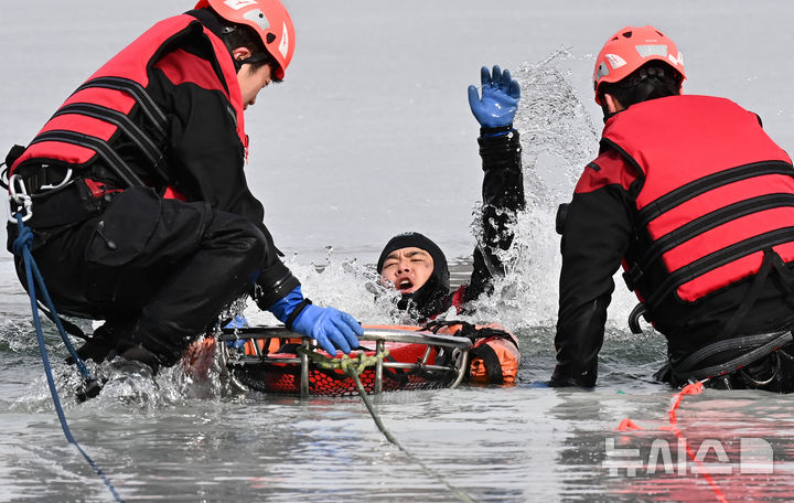 [용인=뉴시스] 김종택 기자 = 5일 경기도 용인시 이동읍 이동저수지에서 용인소방서 구조대원들이 겨울철 수난사고 대응능력 강화를 위한 동계수난구조훈련을 하고 있다. 2025.02.05. [email protected]