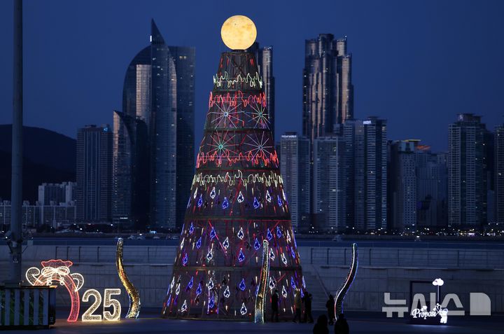 [부산=뉴시스] 하경민 기자 = 5일 부산 남구 용호별빛공원에 설치된 높이 17.5m 크기의 'LED 달집'이 불을 밝히고 있다.