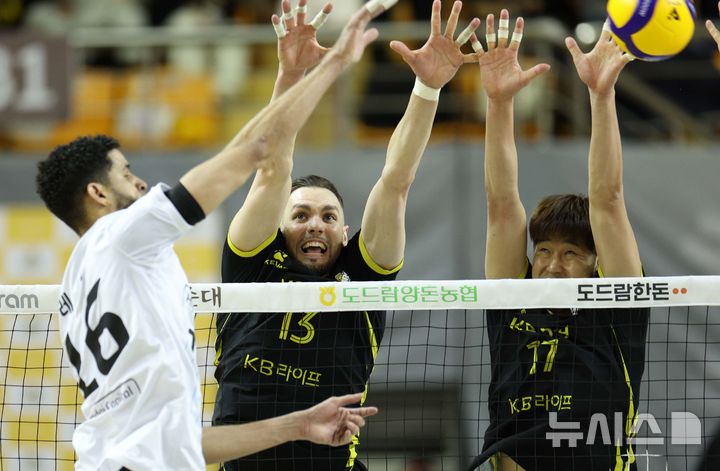 [의정부=뉴시스] 고범준 기자 = 5일 경기도 의정부시 경민대학교 기념관(체육관)에서 열린 2024-2025 V-리그 남자부 KB손해보험 스타즈와 현대캐피탈 스카이워커스의 경기, KB손해보험 비예나와 차영석이 블로킹 하고 있다. 2025.02.05. [email protected]