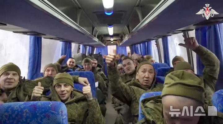[벨라루스=AP/뉴시스] 러시아 국방부가 제공한 사진에 5일(현지 시간) 우크라이나와 포로 교환으로 풀려난 러시아군 병사들이 벨라루스의 미공개 장소 버스에 앉아 있다. 이날 러시아와 우크라이나가 각각 150명의 전쟁포로를 교환했으며 석방된 러시아군 포로들은 벨라루스에서 심리·의료 지원을 받고 있다. 2025.02.06.