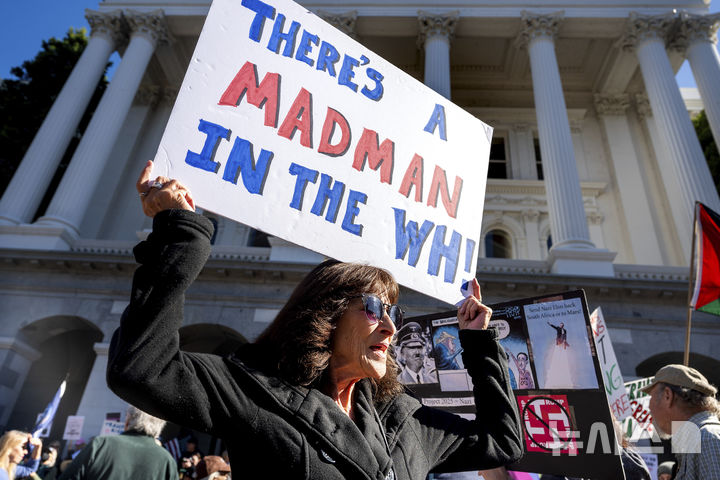 [새크라멘토=AP/뉴시스] 5일(현지 시간) 미 캘리포니아주 새크라멘토의 캘리포니아주 의사당 앞에서 한 여성이 손팻말을 들고 반트럼프 시위에 참여하고 있다. 트럼프 대통령의 강력한 이민 단속과 추방 정책에 항의하는 시위가 미국 곳곳으로 확산하고 있다. 2025.02.06.
