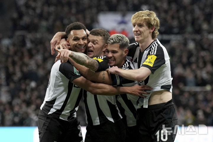 [뉴캐슬=AP/뉴시스] 뉴캐슬 유나이티드의 제이컵 머피(왼쪽)가 5일(현지 시간) 영국 뉴캐슬의 세인트 제임스 파크에서 열린 2024-25 잉글랜드 리그컵(카라바오컵) 4강 2차전 아스널과의 경기 전반 19분 선제골을 넣은 후 동료들과 기쁨을 나누고 있다. 뉴캐슬이 2-0으로 승리해 1,2차전 합계 4-0으로 아스널을 꺾고 결승에 진출했다. 2025.02.06.