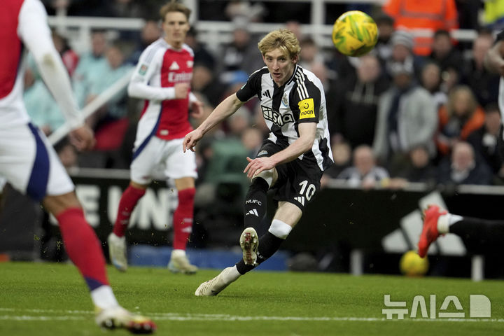 [뉴캐슬=AP/뉴시스] 뉴캐슬 유나이티드의 앤서니 고든이 5일(현지 시간) 영국 뉴캐슬의 세인트 제임스 파크에서 열린 2024-25 잉글랜드 리그컵(카라바오컵) 4강 2차전 아스널과의 경기 후반 7분 추가 골을 넣고 있다. 뉴캐슬이 2-0으로 승리해 1,2차전 합계 4-0으로 아스널을 꺾고 결승에 진출했다. 2025.02.06.