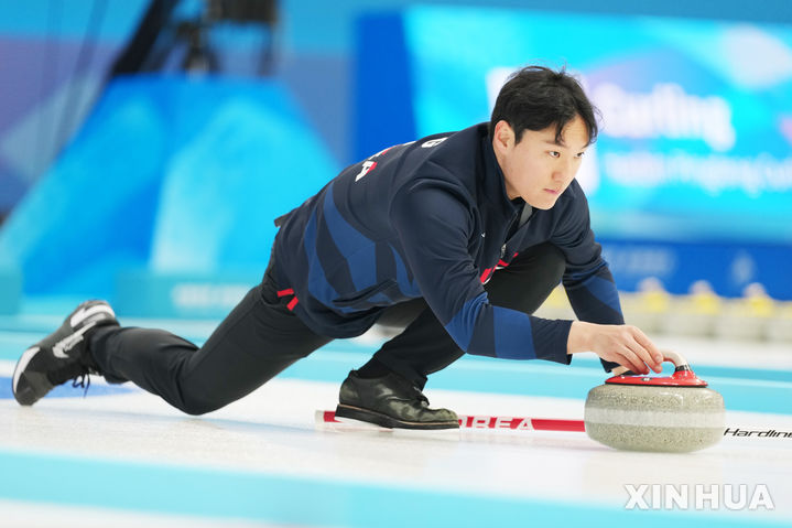 [하얼빈=신화/뉴시스] 성지훈과 김경애가 6일(현지 시간) 중국 하얼빈의 핑팡 컬링 아레나에서 열린 2025 하얼빈 동계아시안게임 컬링 믹스더블(혼성 2인조) 조별 예선 B조 4차전에서 한유-왕즈위 조(중국)와 경기하고 있다. 김경애-성지훈이 4-6으로 패해 2승 2패, 조 3위를 기록해 이후 열리는 키르기스스탄과의 최종전에서 승리해야 '4강 진출전'을 바라볼 수 있게 됐다. 2025.02.06.