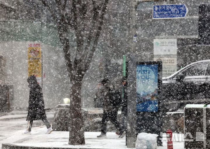 [서울=뉴시스] 이영환 기자 = 서울 전역에 대설주의보가 발령된 6일 오후 서울 강남구 봉은사역 인근에서 시민들이 이동하고 있다. 2025.02.06. [email protected]