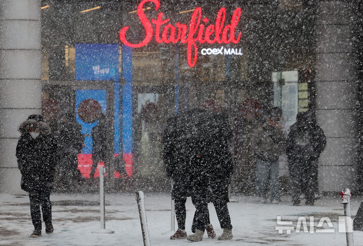 [서울=뉴시스] 이영환 기자 = 서울 전역에 대설주의보가 발령된 6일 오후 서울 강남구 코엑스 인근에서 시민들이 이동하고 있다. 2025.02.06. [email protected]