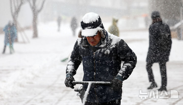 [서울=뉴시스] 홍효식 기자 = 서울 전역에 대설주의보가 발효된 6일 서울시청 앞에서 관계자가 제설작업을 하고 있는 가운데 모자와 외투 위로 눈이 쌓여있다. 2026.02.06. [email protected]