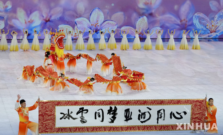 [하얼빈=신화/뉴시스] 7일(현지 시간) 중국 하얼빈 국제 컨벤션 전시 스포츠센터에서 2025 하얼빈 동계 아시안게임 개막식 식전 공연이 펼쳐지고 있다. 2025.02.07.