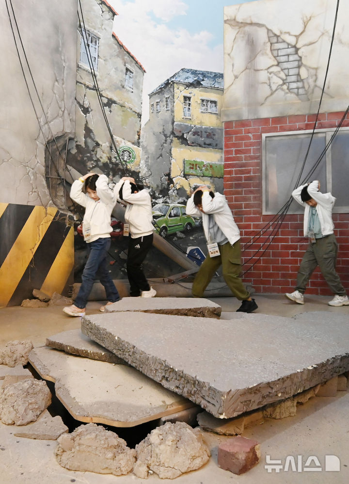 [오산=뉴시스] 김종택 기자 = 7일 경기도 오산시 국민안전체험관을 찾은 어린이들이 지진 대피 체험을 하고 있다.